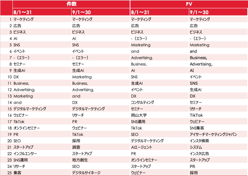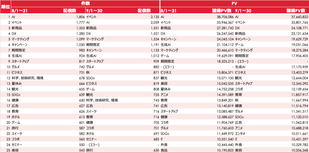 2025年9月の各種プレスリリース配信サービスで利用されたキーワードの、件数と仮想PV*のランキング