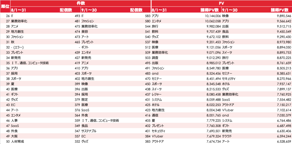 10位より下では8月に配信数で新たにランクインした「秋」が順位を上げ(31位→11位)、PVでも16位に入りました。